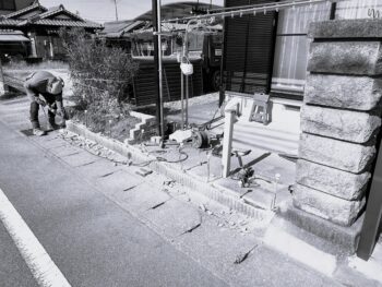 土を鋤取り、防草シートを敷き詰めてから、タイルや砕石を。